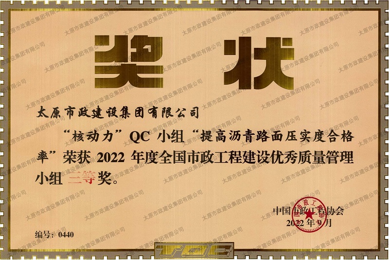 資質(zhì)(zhì)證書(shū) 營(yíng)業(yè)(yè)執(zhí)(zhí)照 2022年度市政工程最高質(zhì)(zhì)量水平評(píng)價(jià)_H5-1路道路及配套工程(二標(biāo)段) 2022年度工程建設(shè)(shè)誠(chéng)信典型企業(yè)(yè) 中國(guó)施工企業(yè)(yè)管理協(xié)(xié)會(huì)_AAA級(jí)企業(yè)(yè)信用等級(jí) 2022年度全國(guó)市政工程建設(shè)(shè)優(yōu)(yōu)秀質(zhì)(zhì)量管理小組三等獎(jiǎng)_''核動(dòng)力QC小組”提高瀝青路面壓實(shí)度合格率”
